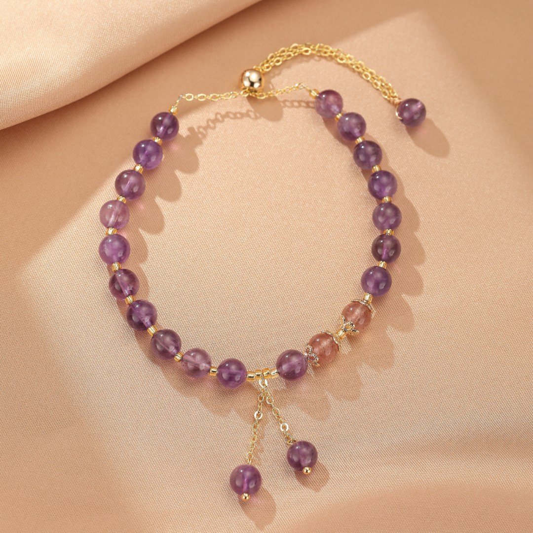 🔮 Laissez-vous envoûter par les nuances profondes de l’améthyste et les éclats rosés du quartz fraise. Ce bracelet ajustable mêle harmonieusement mystère et tendresse pour sublimer votre poignet d’une énergie subtile et élégante.