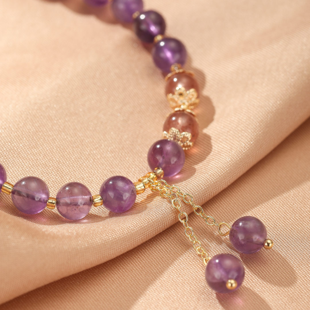 💜 L’améthyste est traditionnellement associée à la protection et à la sagesse intérieure, tandis que le quartz fraise évoque la joie, l’amour doux et le lien au cœur. Les perles facettées du quartz captent délicatement la lumière, rehaussées par des détails dorés finement ouvragés.