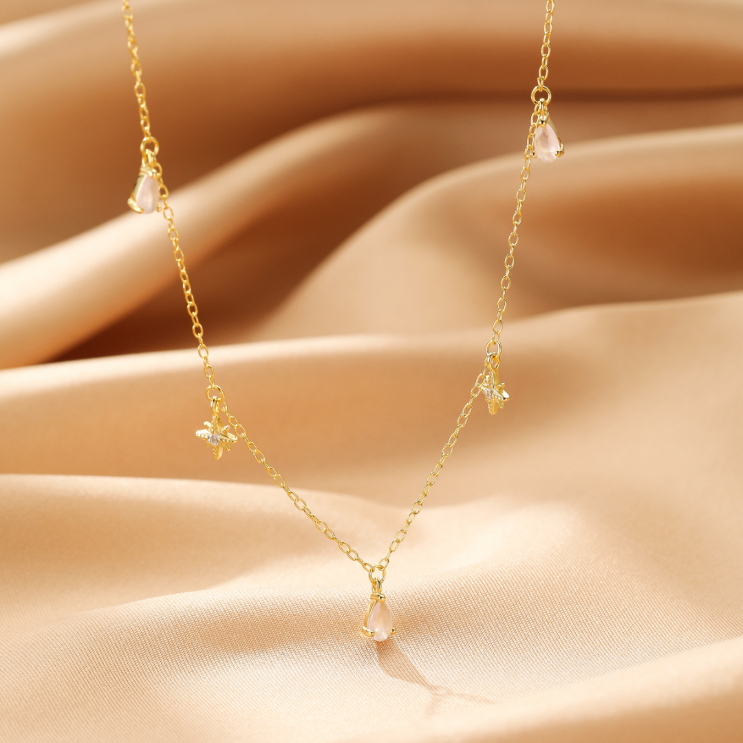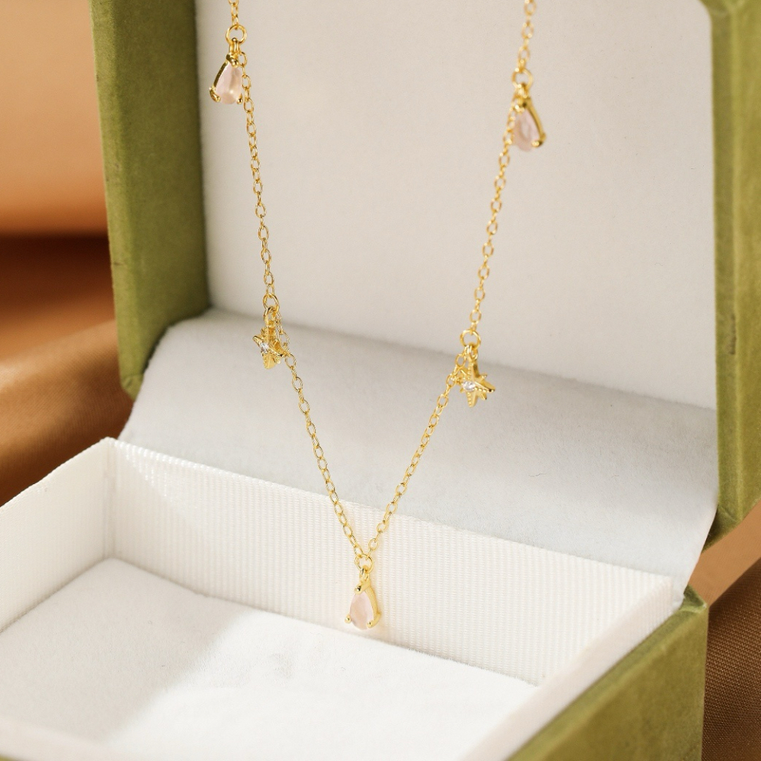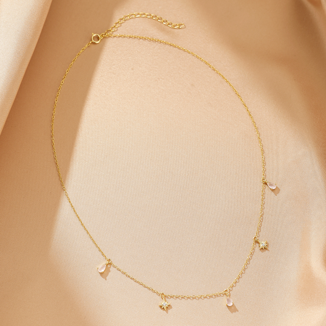 ✨ Laissez parler votre lumière intérieure avec ce collier en argent 925 plaqué or, orné de délicats pendentifs étoilés et de gouttes de quartz rose. Un bijou féminin et aérien, inspiré des constellations, pour une touche poétique à votre style quotidien.