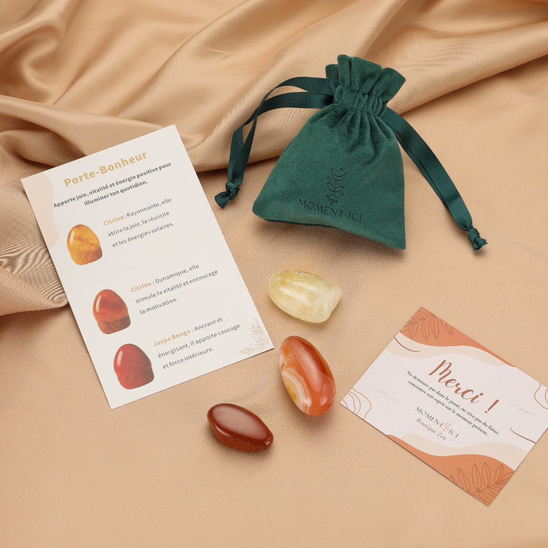 👐 Utilise ce pochon en l’installant dans ton sac, ton espace zen, ou en prenant chaque pierre en main pour ressentir leur vibration positive. Leur présence t’accompagne au fil des jours pour élever ton humeur et t’ancrer dans l’instant. Chaque pochon est livré avec une carte explicative détaillant les bienfaits de chaque pierre, pour t’aider à te connecter à leur énergie.