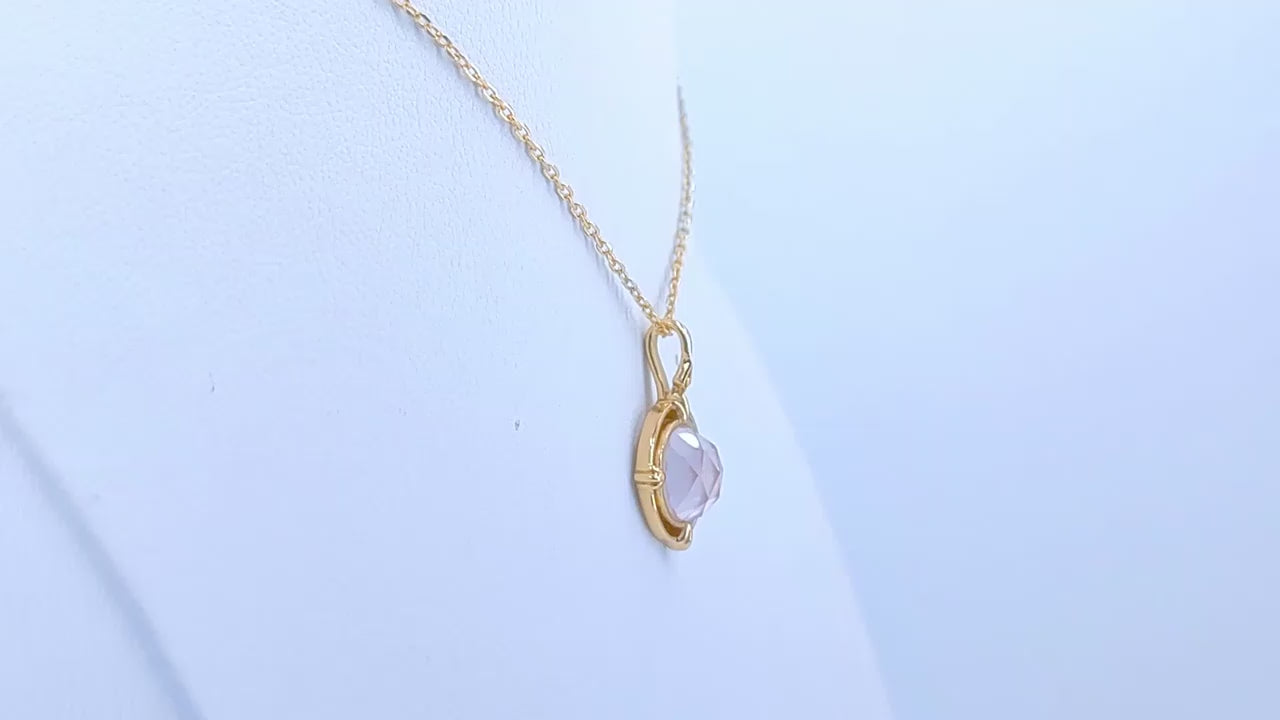 La couleur dominante est le rose pâle et lumineux du Quartz Rose, mis en valeur par la finition dorée chaude du placage Or 10K. La pierre offre des reflets 'Aura Radieuse', créant un jeu de lumière subtil et romantique. La teinte est douce et facile à assortir.