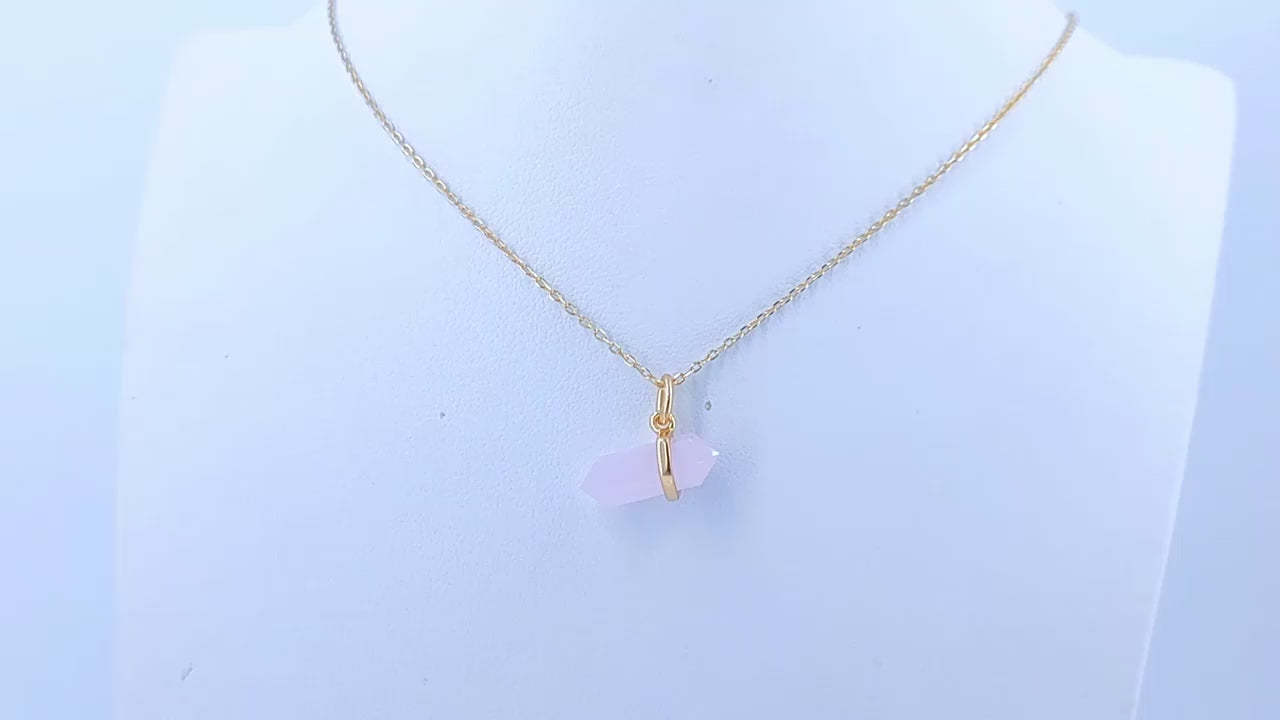 ✨ Chaque pendentif est constitué d’un Quartz Rose naturel (8 x 12,5 mm) taillé en pointe géométrique, serti dans une monture en Argent 925 plaqué Or 10K pour sublimer la pierre avec chaleur et sophistication.