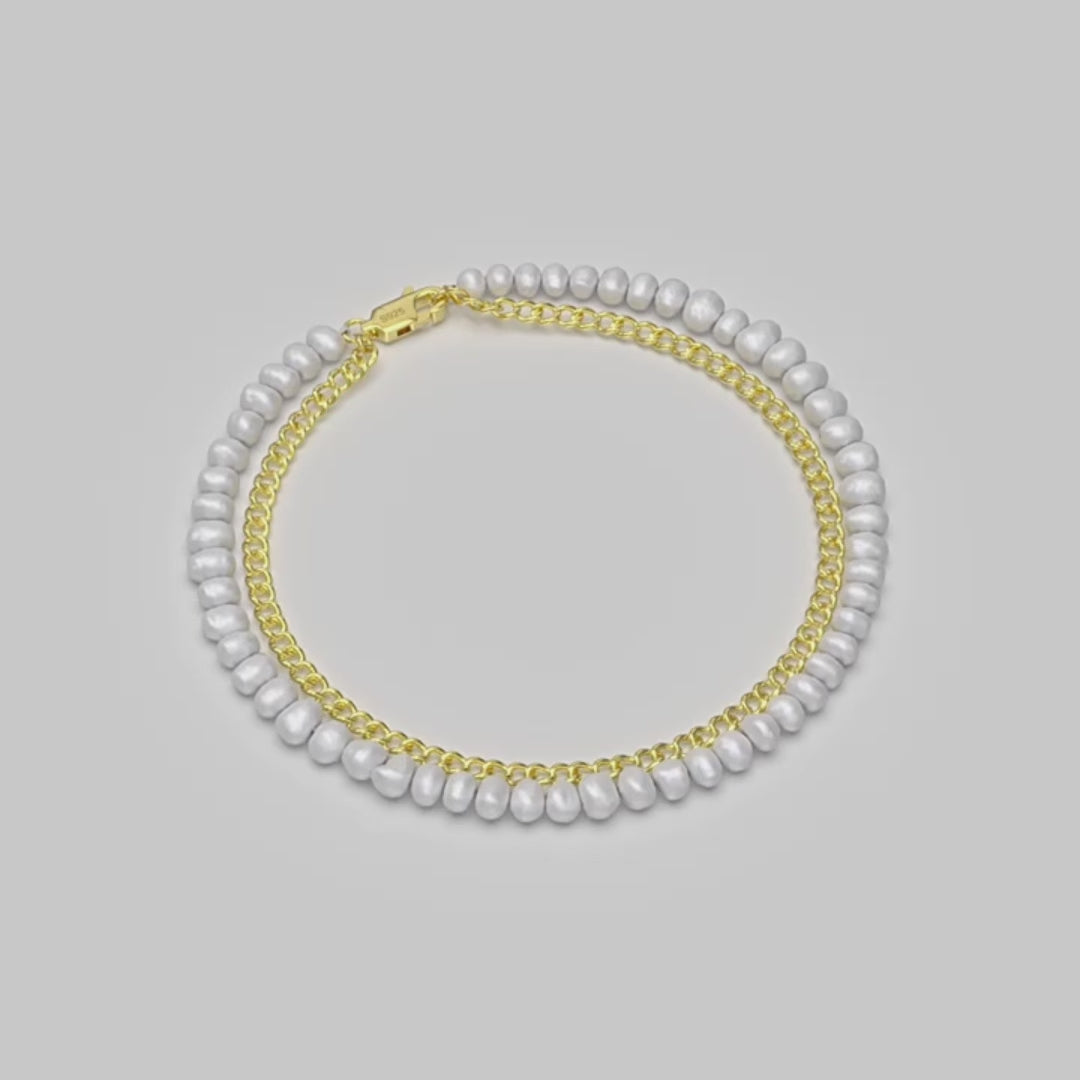 ✨ Alternant entre la douceur des perles de 4-5 mm et l’éclat métallique, ce bracelet de 20 cm capte l’essence d’une dualité élégante. La chaîne tissée en plaqué or ajoute une dimension de luxe sans compromettre la virilité.