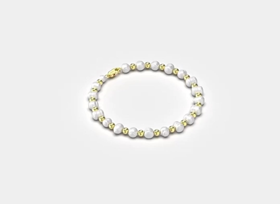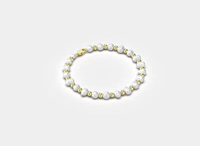 La couleur dominante des perles est un blanc ou crème nacré classique, typique des perles d'eau douce. Elles sont mises en valeur par les petites billes métalliques qui arborent une teinte or jaune riche et chaleureuse.